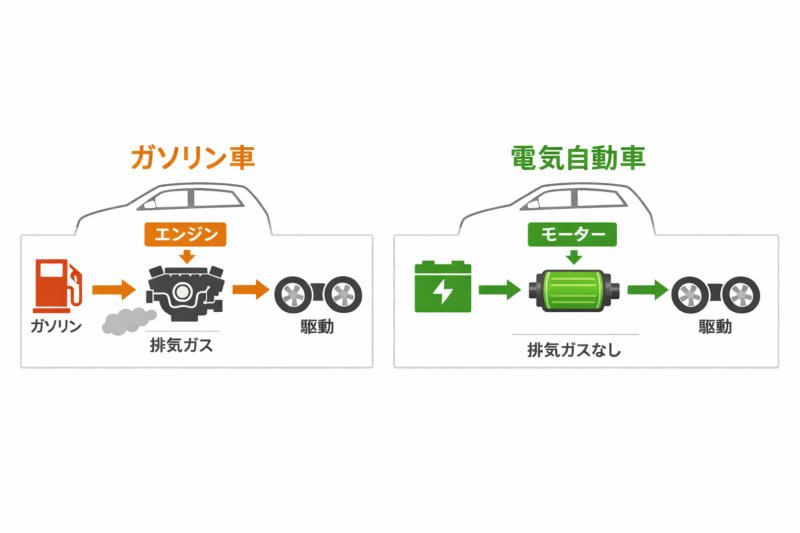 一方、電気自動車はガソリンを使いません。バッテリーに蓄えた電気を使い、モーターを回してタイヤを動かします。エンジンのような燃焼工程がないため、走行中に排気ガスは出ません。
