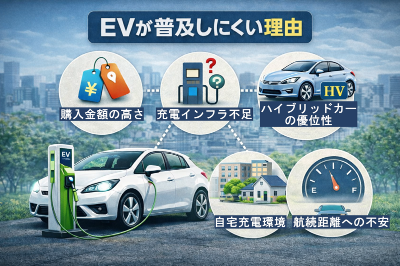 その背景には、いくつかの理由があると考えられています。ここでは、EVが普及しにくいと言われる代表的なポイントを整理してみます。