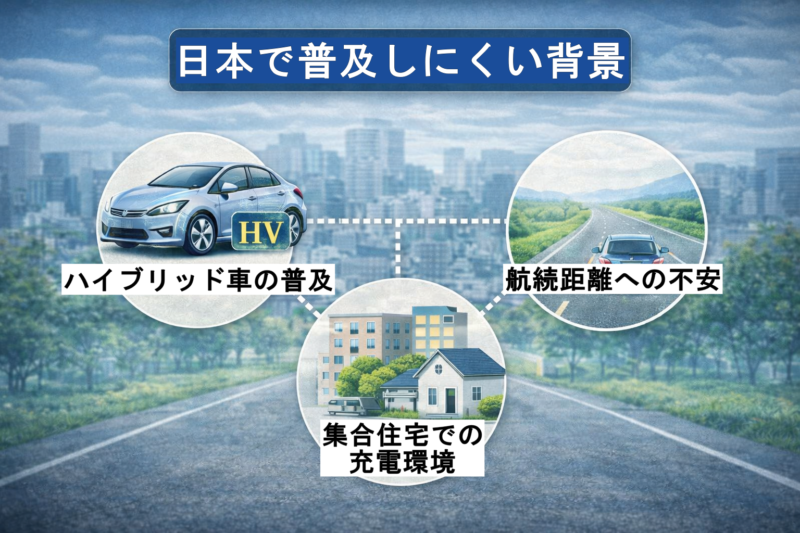 日本でEVの普及がゆっくりに見える理由はいくつかあります。